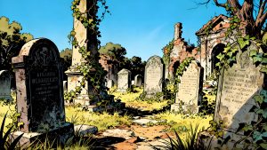I think if it’s sunny it can’t be all bad. But then, bad things happen even when the sun shining, don’t they? But anyway, this is just a comic book illustration of a graveyard. And graveyards have always carried their appeal and the …. For me, there is another layer